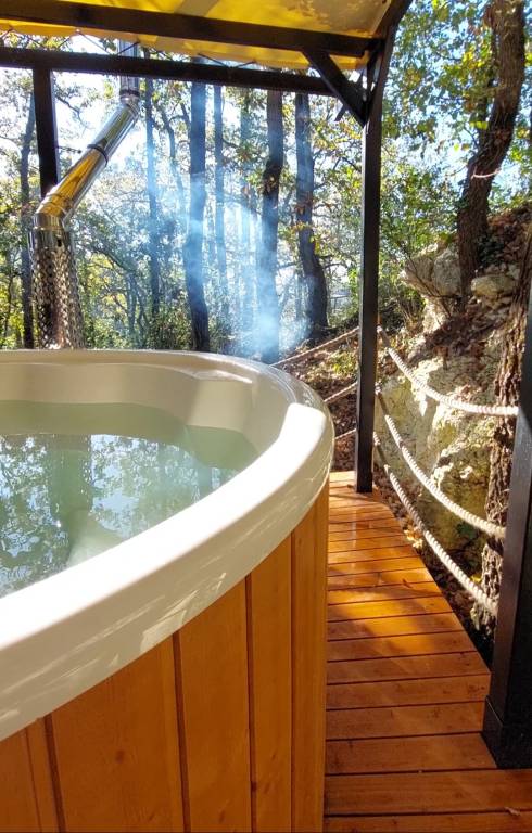 Le bois, utilisé pour chauffer l’eau, offre un arôme naturel et chaleureux, créant une ambiance relaxante unique. Se plonger dans un bain fumant en plein air, entouré par les arbres et le chant des oiseaux, procure un effet apaisant immédiat sur le stress et l’anxiété. En hiver comme en été, c’est une expérience sensorielle complète : la chaleur du bain contraste avec l’air frais extérieur, favorisant le bien-être physique et mental.